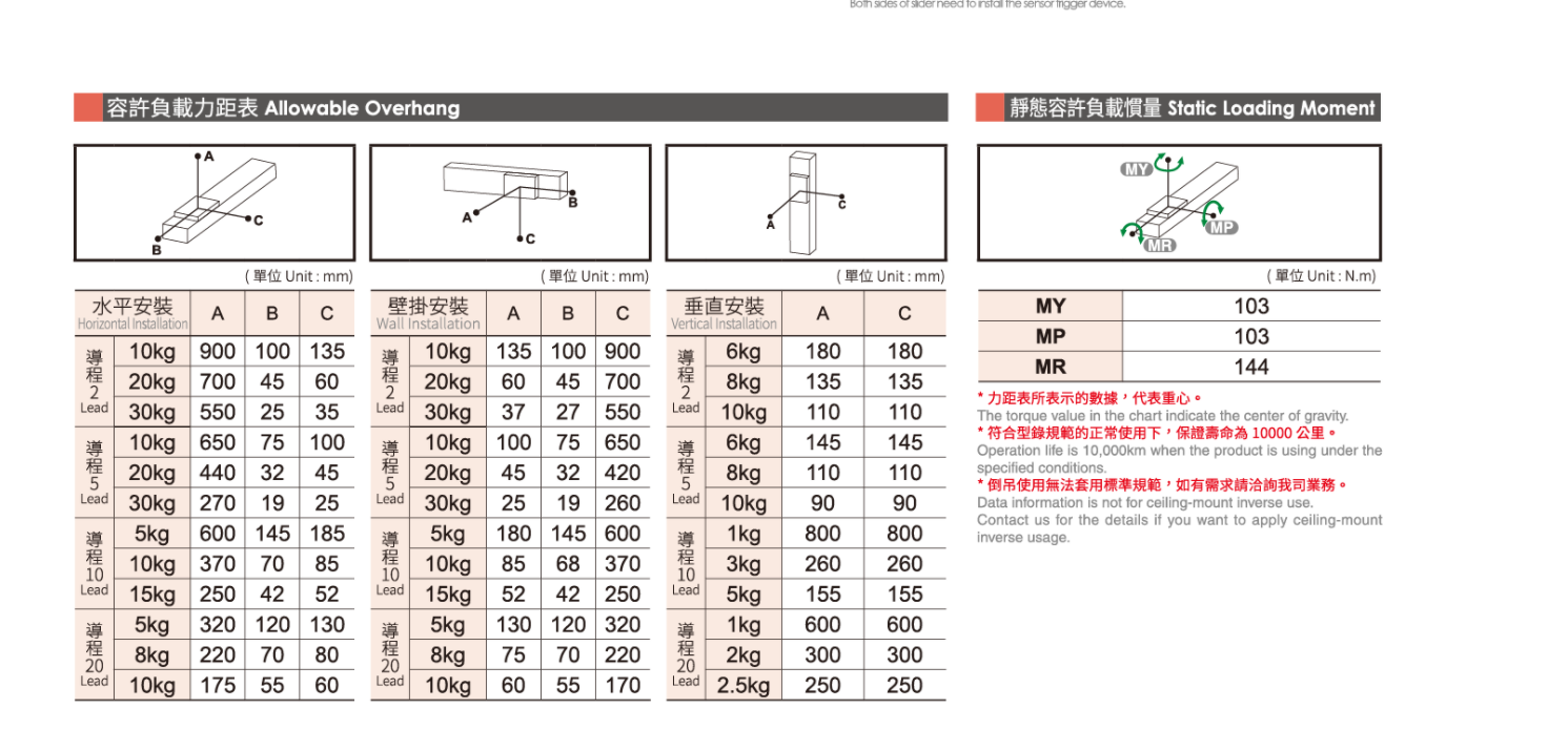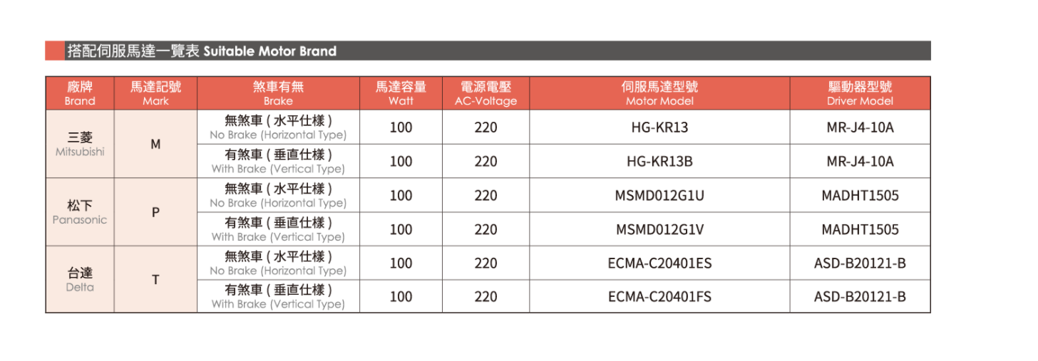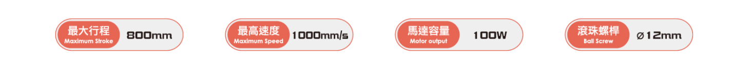 位置重覆精度:±0.005(mm)螺桿導程:2/5/10/20(mm)最高速度:100/250/500/1000(mm/s)最大可搬重量 水平使用:30/30/15/10(kg)最大可搬重量 垂直使用:10/10/5/2.5(kg)定格推力:854/341/170/85(N)標準行程:50-800 / 50(mm)*行程超過600時,會產生螺桿偏擺,此時請將速度調降。*馬達加減速設訂0.2秒。