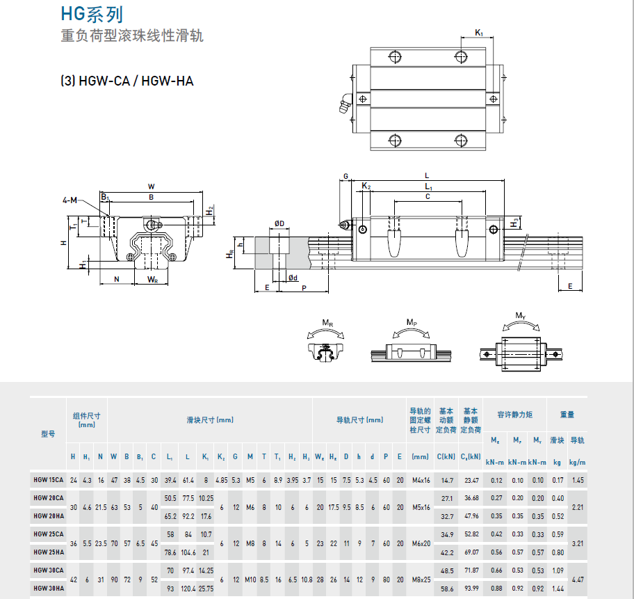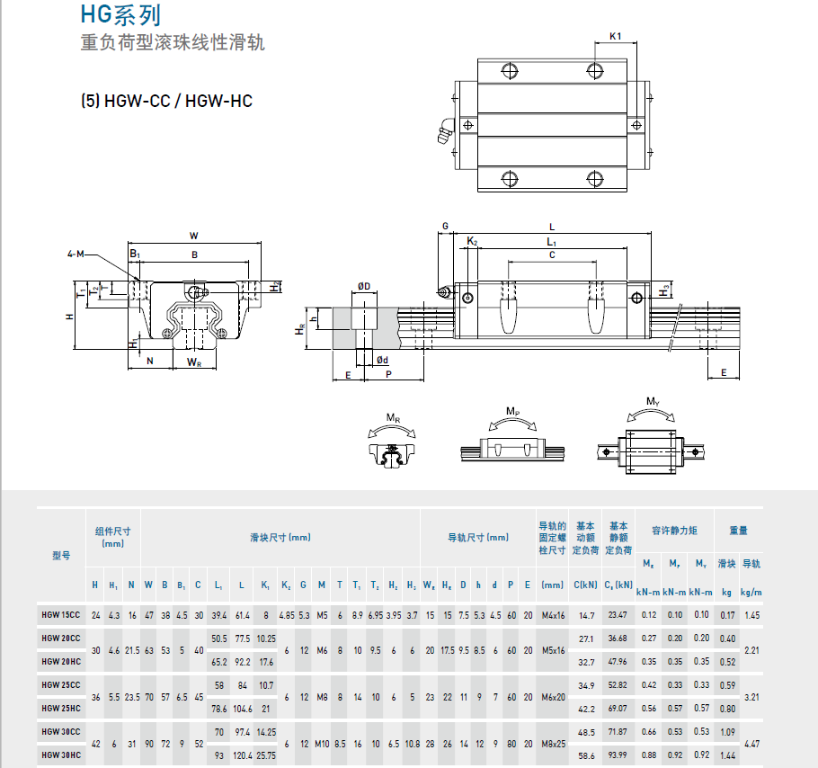 HG系列線性滑軌,為四列式單圓弧牙型接觸線性滑軌,同時整合最佳化結構設計之重負荷精密線性滑軌,相較於其他之線性滑軌提昇了負荷與剛性能力;具備四方向等負載特色、及自動調心的功能,可吸收安裝面的裝配誤差,得到高精度的訴求。高速度、高負荷、高剛性與高精度化概念已成為未來全世界工業產品發展的趨勢,HG系列線性滑軌,即為基於此理念開發之產品。